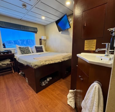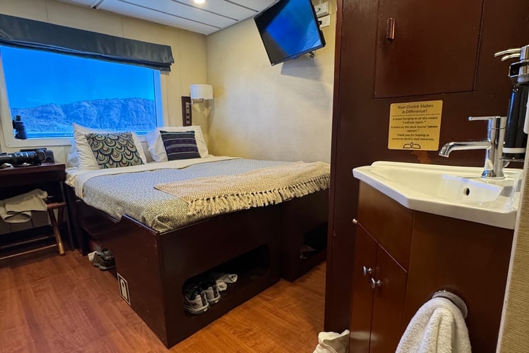 Our room—a Navigator cabin with a queen bed—was cozy but perfectly comfortable, complete with a picture window. One of our fellow travelers had a leak in her solo room and was later moved into a Navigator cabin near us. She was thrilled with the upgrade, joking that in her original room she could stretch her arms and touch both walls—and she wasn’t very tall.